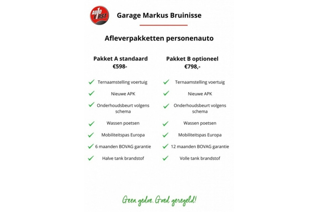 Alle voertuigen worden standaard afgeleverd met afleverpakket A hiervoor rekenen we een vaste prijs van €598,- De geadverteerde prijs is excl. afleverpakket.